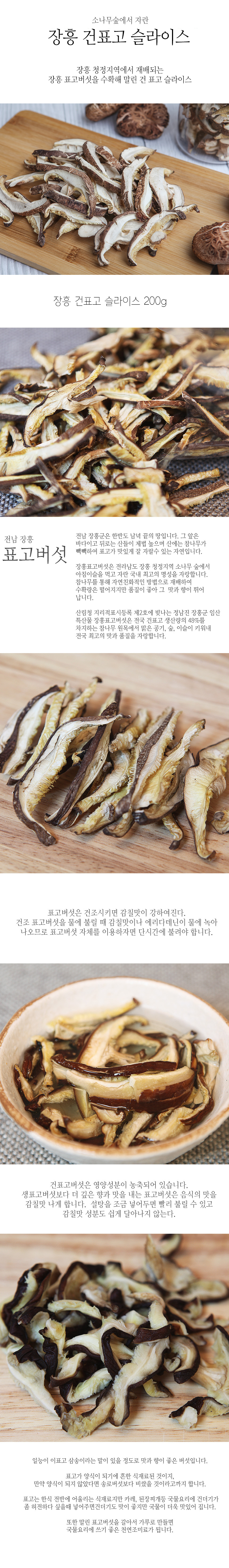 전남 장흥군은 한반도 남녀 끝의 땅입니다. 그 앞은 바다이고 뒤로는 산들이 제법 높으며 산에는 참나무가 빽빽하여 표고버섯이  맛있게 잘 자랄수 있는 자연입니다. 장흥표고버섯은 전라남도 장흥 청정지역 소나무 숲에서 아침이슬을 먹고 자란 국내 최고의 명성을 자랑합니다. 참나무를 통해 자연친화적인 방법으로 재배하여 수확량은 떨어지지만 품질이 좋아 그 맛과 향이 뛰어 납니다,  산림청 지리적표시등록 제2호에 빛나는 정남진 장흥군 임산 특산물 장흥표고버섯은  참나무 원목에서 맑은 공기, 숲, 이슬이 키워내 전국 최고의 맛과 품질을 자랑합니다.