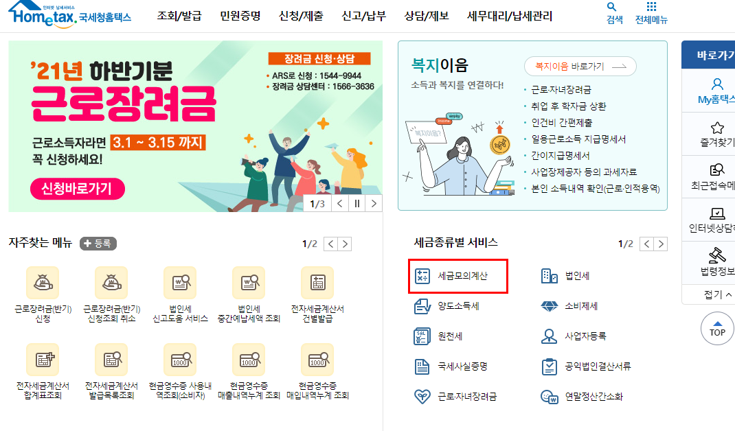 홈텍스(https://www.hometax.go.kr/ )에 접속하시면 오른쪽 메뉴에 '세금 모의계산' 라는 메뉴가 있습니다.