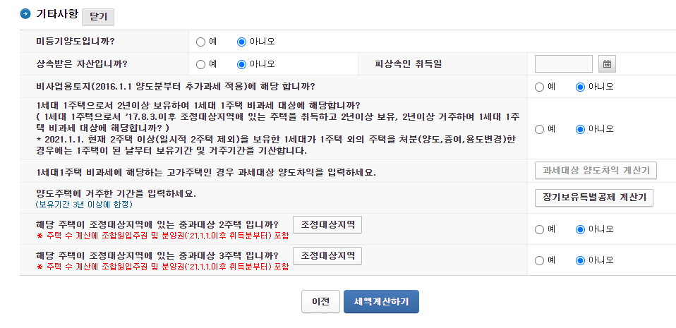 양도가액·취득가액 모두 알고있는 경우 , 취득가액을 모르는 경우 등 선택을 하시고 테스트를 해보세요