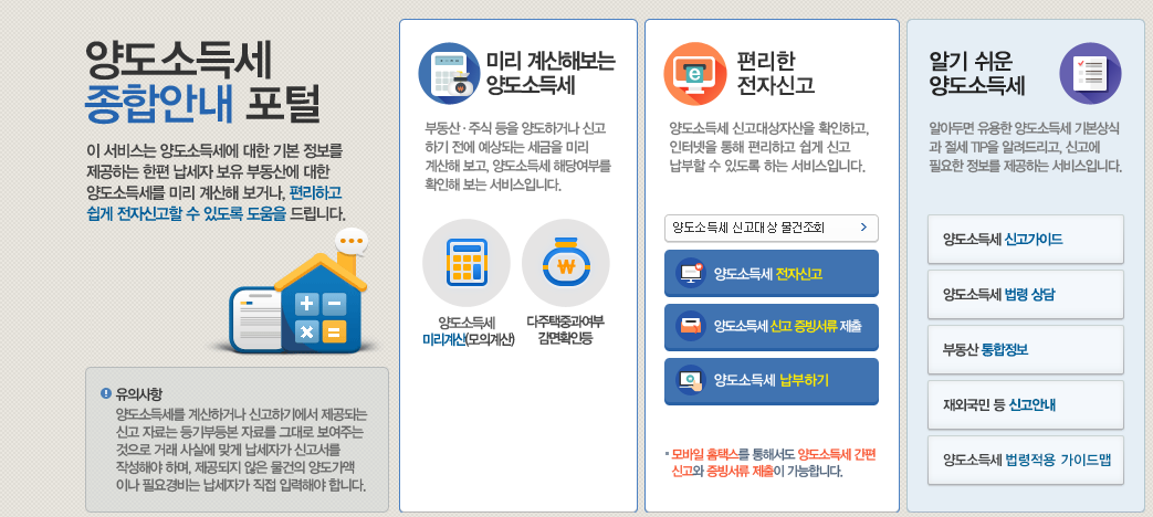 양도세는 개인이 계산해보기에는 조금 어려운 부분이있는데요 국세청 홈택스에서는 양도소득세자동계산을 제공해주고있어 쉽게 해볼수가 있습니다.