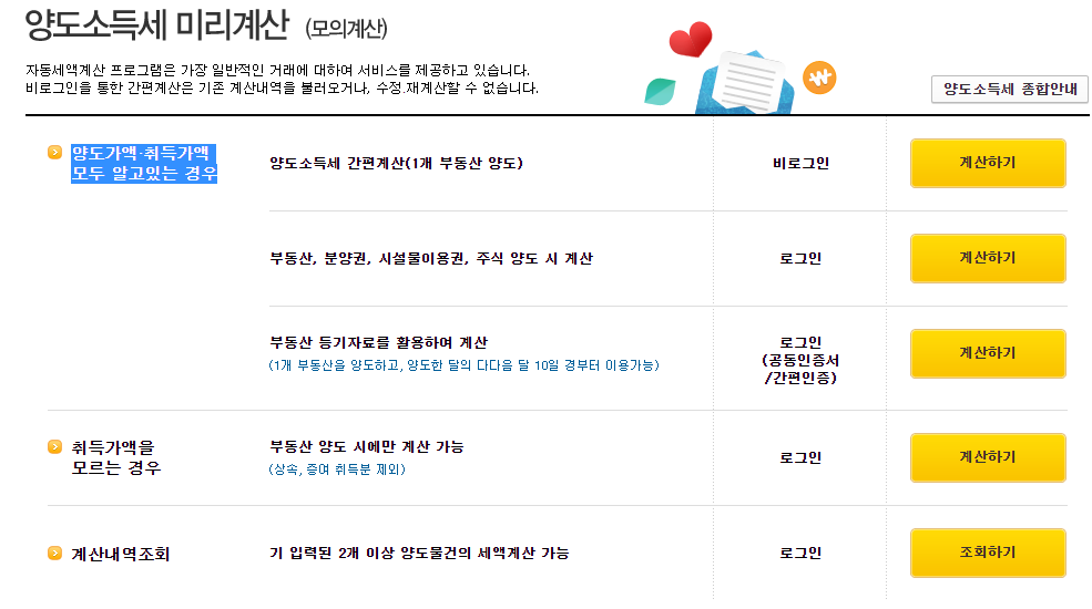 양도소득세 미리계산 페이지에 들어가시게되면 다양한 계산방식이 있는데요