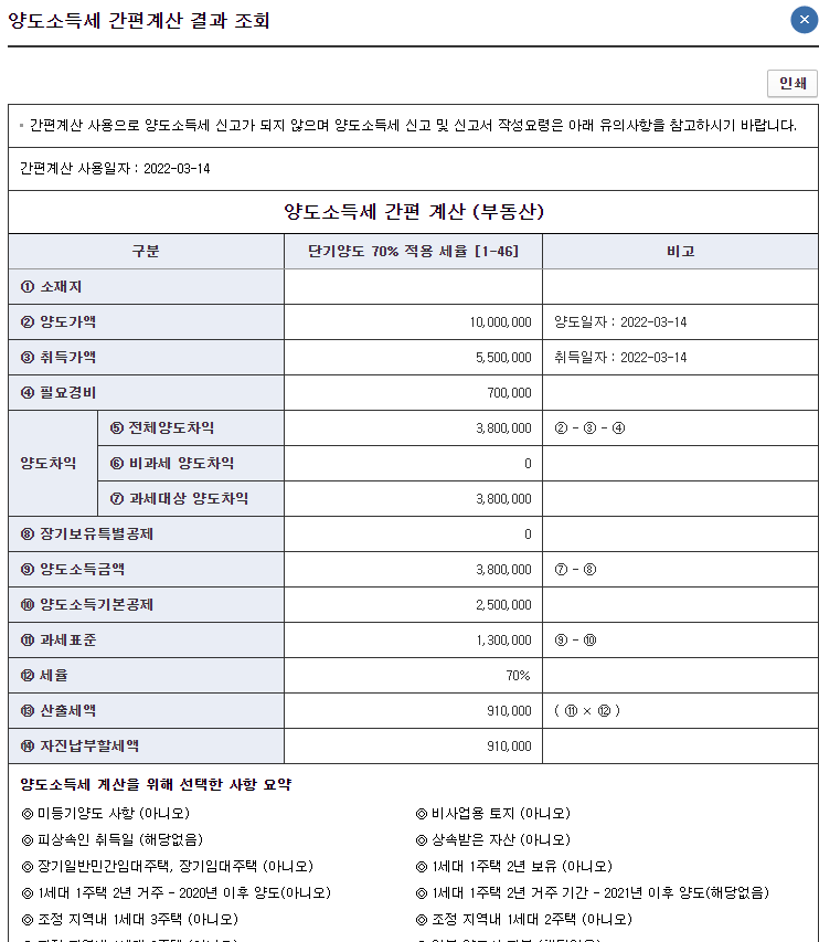 일단 모의계산을 클릭후에 양도소득세자동계산을 해보시는게 좋습니다.