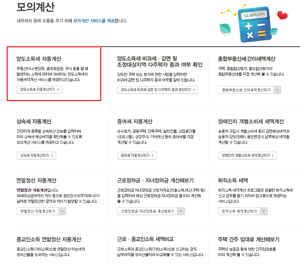 세금 모의계산 메뉴를 클릭하시면 모의계산 페이지로 넘어가게되는데 이곳에는 양도소득세자동계산 뿐문 아니라 세무처리에 도움이 되는 다양한 모의 계산 서비를 제공하고 있습니다. 양도소득세 메뉴를 클릭하시게되면 모으계산 해볼수 있는메뉴와 직접 신청할수 있는곳으로 이동을 할수가 있습니다.