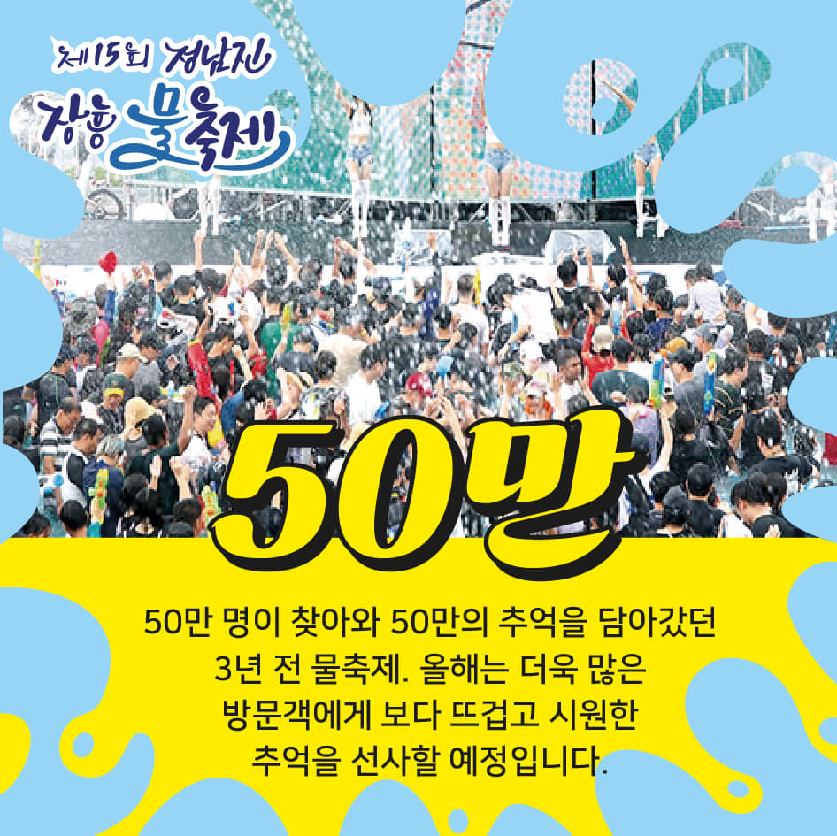 물펑선 20만개 이상이 날아드는 지상최대의 워터붑, 살수대첩 거리 퍼레이드 등 차가운 물이 무덥기로 예상된 올 여름을 지배합니다. 더위를 잊은 물의 나라가 여러분을 기다리고 있습니다.