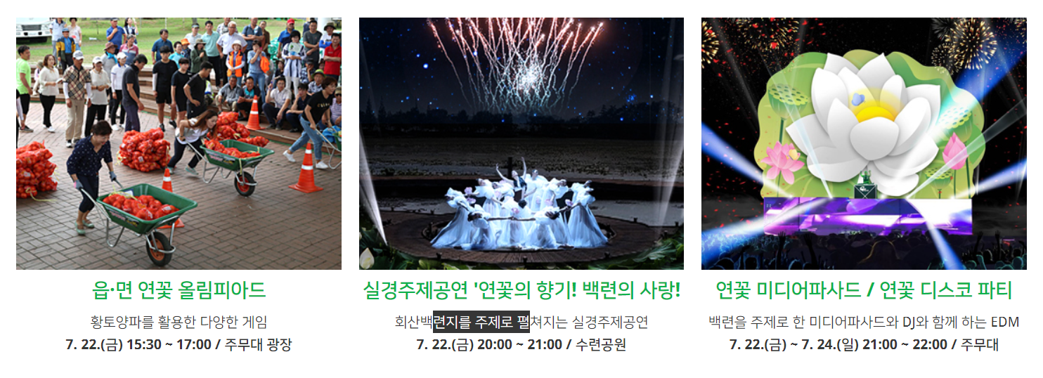 25년전에 시작이 되었고 매년 여름 무안 회산 백련지 일대에서 개최가 됩니다. 10만평 규모의 초록 연잎으로 가득채운 모습은 동양 최대 장관을 이룹니다.