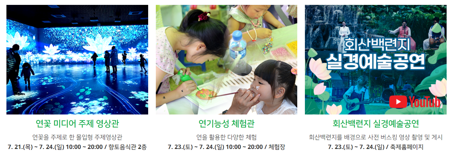 초록색 연잎 사이로 하얀꽃망울을 틔우는 백련을 볼 수 있으며 곳곳에 붉은 홍련도 보실수가 있습니다. 백련지 일대에는 다채로운 행사와 함께 여름의 낭만을 즐길수가 있습니다.