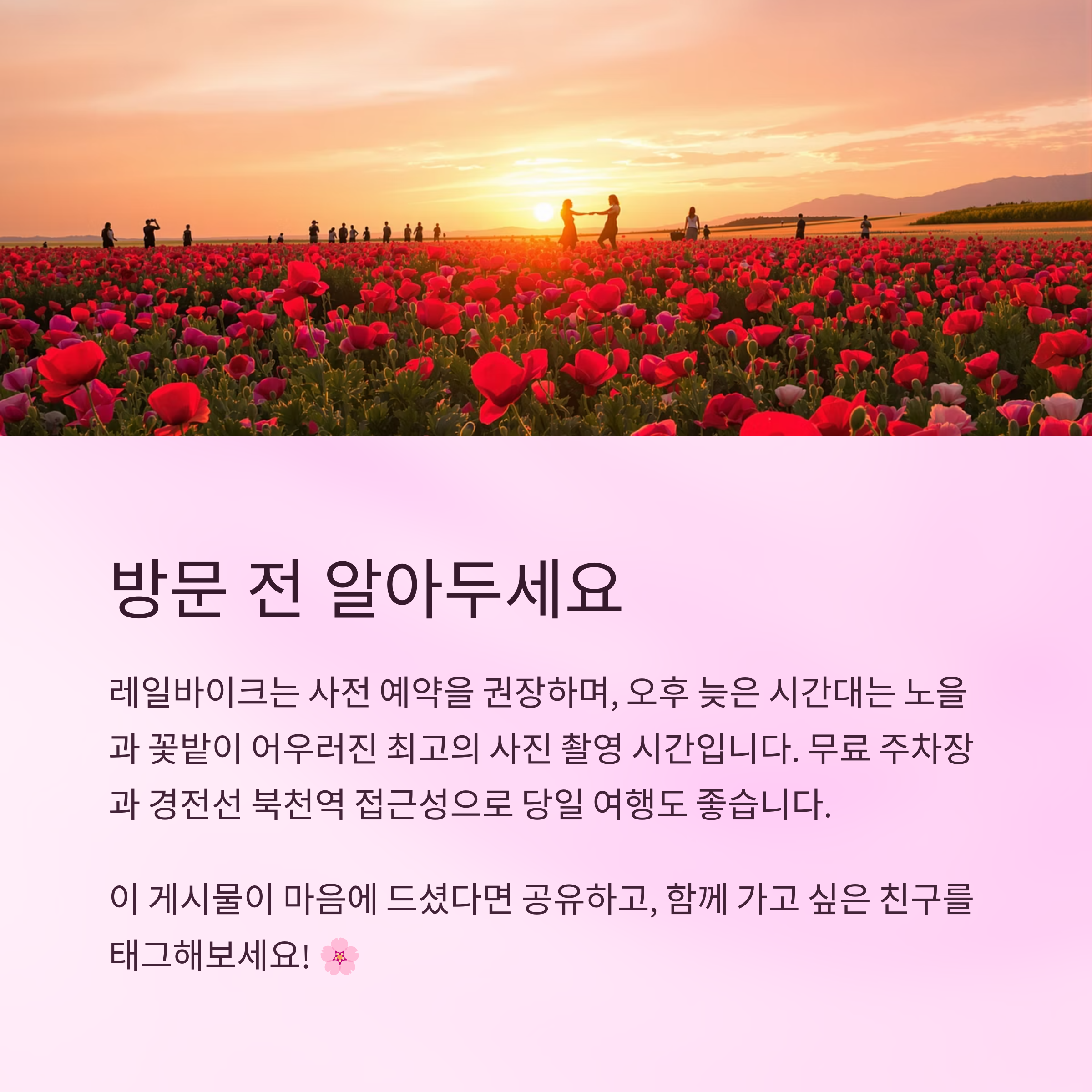 • 사진 촬영: 오후 늦은 시간대에는 노을과 꽃밭이 어우러져 아름다운 사진을 촬영할 수 있는 최적의 시간입니다.