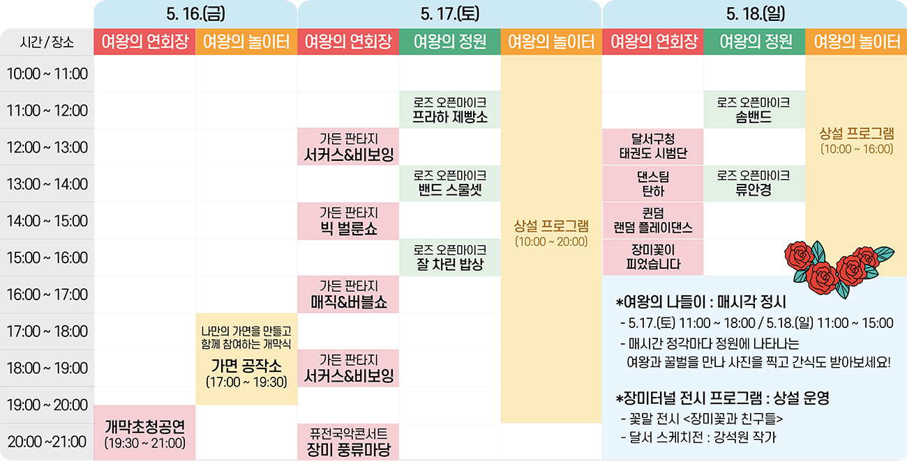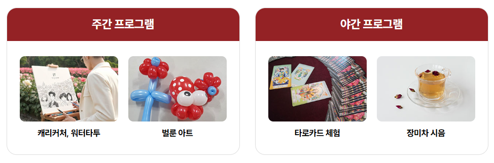 | 로즈 아뜰리에 | 장미팔찌, 풍선, 페이스페인팅 | 정원 내 체험부스 |