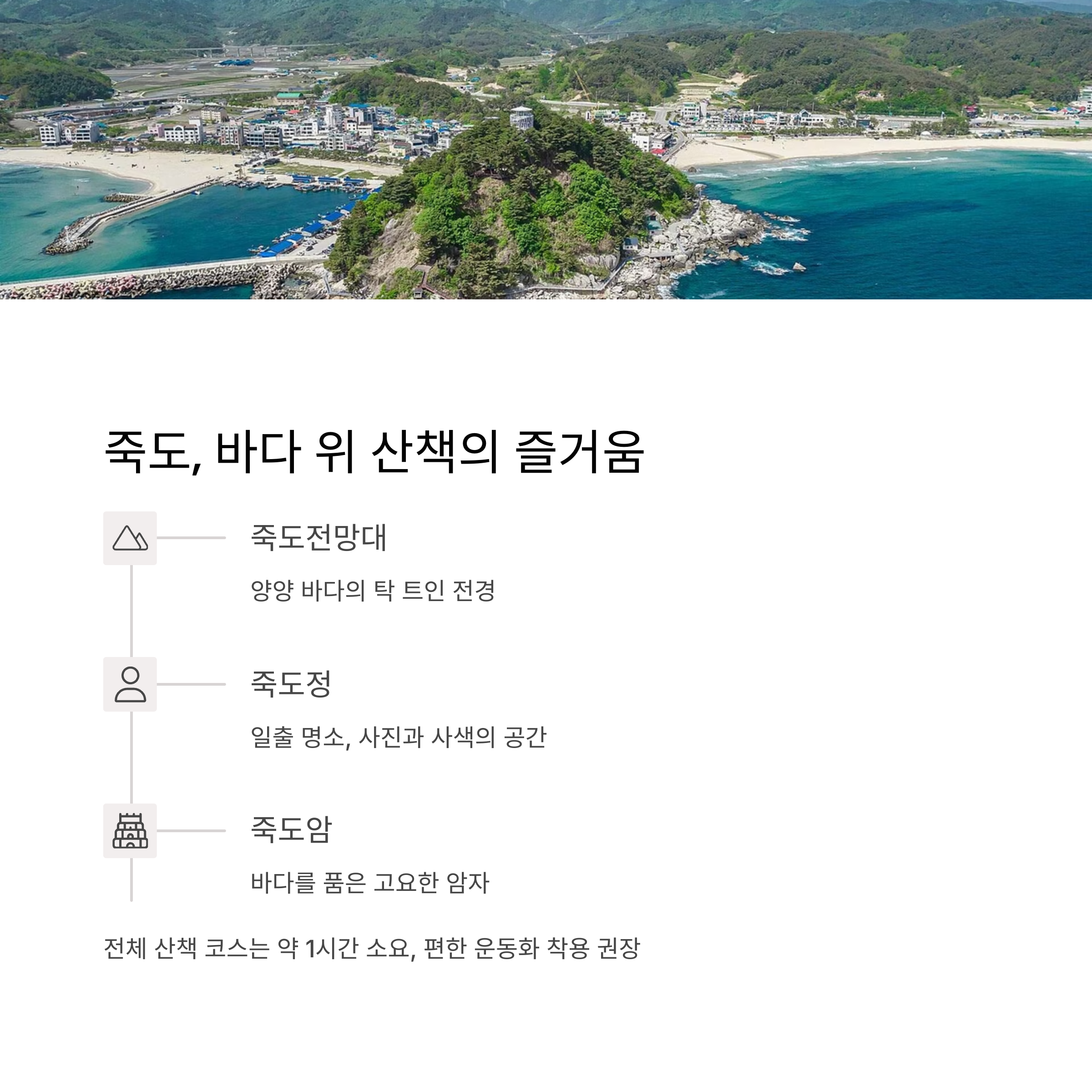 죽도전망대에 오르면 양양 바다의 탁 트인 전경이 한눈에 들어오며, 일출 명소인 죽도정에서는 사진 촬영과 사색 모두가 가능합니다.